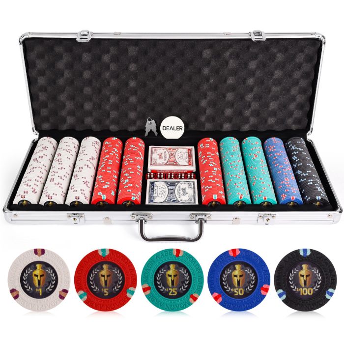 The 13.5 gram 500 piece Spartan Clay Poker Chips is good for 5-8 players. This set features the great sound and feel of a clay chip with a metal insert for an extra heavyweight poker chip.