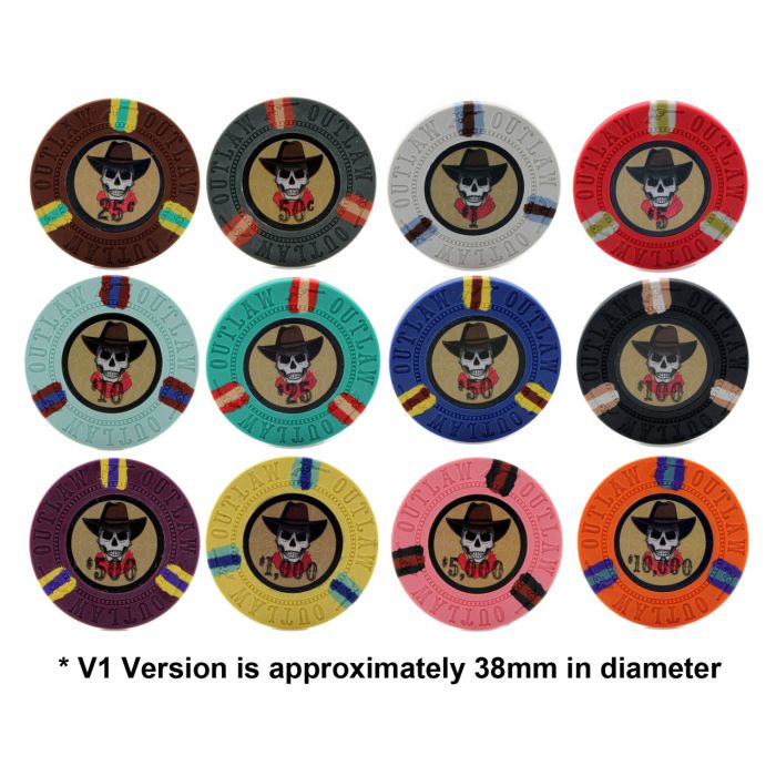 These chips are slightly smaller in diameter than standard Outlaw chips. The chips are approximately 38mm. Once current inventory sells out, it will not be restocked.
