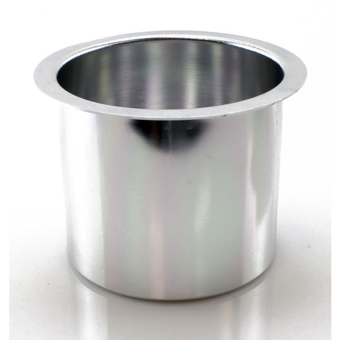 The aluminum cup holder is designed to fit into to cup holder compartments that are 3.25 inches in diameter. The total diameter including the lip is 4 inches. This cup holder will fit drinks 3.25 inches in diameter or less and it is 3 inches deep. The aluminum cup holders will not rust and are very durable while adding a classy appearance to your poker table.