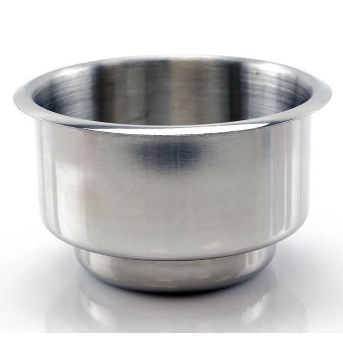The stainless steel cup holder is designed to fit into to cup holder compartments that are 2.5 or 3.5 inches in diameter. The total diameter including the lip is 4 inches. This cup holder will fit drinks 2.5 or 3.5 inches in diameter or less and it is 2.25 inches deep. The stainless steel cup holders will not rust and are very durable while adding a classy appearance to your poker table.